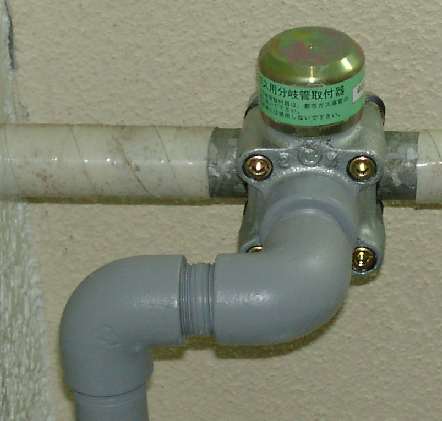【ガス配管工事の新兵器】 【製品名】マジックジョイント 1.ガスを停止せずに工事を完了 2.白テープ巻が既設ガス管 3.この製品をかぶせて取付て 火薬にてガス管に孔をあけ 分岐管よりガスを取出し 4.写真は天井を向いて撮影したものです 5.この機器がガスに使用可となったのは 最近のようですが(当初は可燃ガスは除外)、 25年も前に商品化されていたとは驚きです。 |