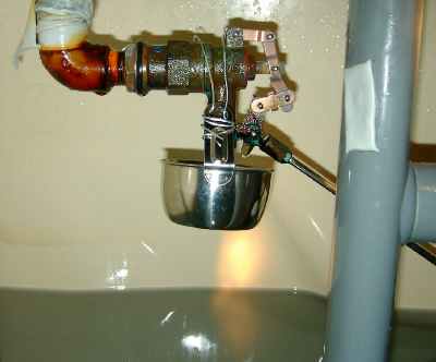1.受水槽内のボールタップ部 エルボ付近に赤錆が露出 2.この色が 黒錆に変化すれば効果あり 3.写真の、ステンレスカップは 弁部より水滴がわずかに落ち 水面に波が発生し、写真撮影に 支障をきたすため取付 4.ここに溜まった水の鉄濃度を測定予定 |