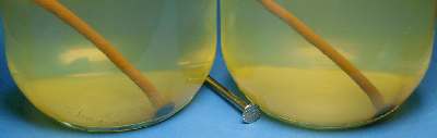2004/12/ 8 上左 普通水 上右 磁化水 2004/12/15 下左 ↑ 下右 ↑ 1.サンドペーパーでは古釘の錆の除去が不完全 2.3日目ごろまでは、錆の状況に差があった 3.1週間後は、区別がつかない錆状況 磁化水の方が、水の透明度が高い 4.黒錆は赤錆より密度が大のため、沈殿か? 5.今後、新品の釘で3日までの比較を実施予定 |