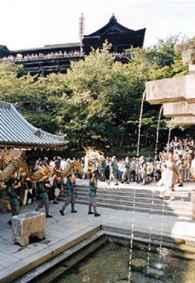 | 9月15日(金)〜17日(日) 観音加持・青龍会 清水寺 TEL 075-551-1234 ○秋日和の清水の舞台、法螺貝を吹き、「転法秀」を先頭に「会奉行」「夜叉神」そして「四天王」 と青龍、「十六善神」の神々が続くという大郡会行の行道が境内を練り歩きます。青龍の八千余枚 に及ぶ鱗は、その内面の一枚一枚に、経文の書かれた和紙が張られています。 観音加持として行なわれる青龍会は創建千二百有余年の清水寺の総意を集めて執り行われ、 魅力ある催事です。現代の感性も随所に見られ、参拝者の評判を呼び、新しい清水寺の 「風景」になっています。 入山料 200円 |