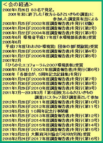 枚方市の各地の調査地を決めて調査会(月1〜2回)を行っています。 (半年毎に予定表を作成)調査結果は、会報・年報などで発表