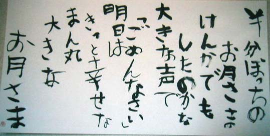 いつも突風のように教室に入ってきてくれます。 なかなか自分の気持ちが整理できなくて、訳もなく悲しくなってしまう事がありました。 『だいじょうぶ 心配しないで おちついて 』 これは、まあくんのおまじないの言葉でした。 でも最近はとても落ち着いてきて「熱でも出すのではないかしら」と心配するくらいお兄さんになってしまいました。 「まあくん、今日何枚書いてくれる?」 「三枚!」 「おまけで四枚!」 「エー!やだ!」 「いいじゃん!おまけのおまけで五枚!」 「エー…いいよ…」 こんなやり取りが大好きです。 詐欺のような私の要求に「仕方ないな…」とあきらめてくれているようで感激してしまいます。 左利きなので、右手で書くのは大変だと思いますが、一生懸命書いてくれます。 大きくなったらパン屋さんになりたいそうです。 お話をたくさん覚えているまあくんの作るパンは、きっと夢いっぱいのパンでしょう。 2001年10月 2002年・・・その後 小学六年生になりました。 すっかりお兄さんになってしまいました。 それはそれですごくいいことなのですが そうなると、あの突風のように入ってきてくれたまーくんも懐かしくなってしまいます。 まーくんのことを思って詩を作ると、いつもお話しの世界になってします。 いつまでも優しい気持ち、持っていようね。 2002年6月 2003年・・・その後 中学生になりました。 ボーイスカウトも、がんばっているようです。 そして、習字の検定試験にも挑戦です。 毎回提出が条件。 ちょっと厳しい先生になろうかな・・・ がんばろうね! 2003年5月 2004年・・・その後 習字の検定試験は、順調に進んでいます。 進級のために、少し厳しいことも言ってしまうのですが、 よくがんばっています。 ボーイスカウトで憧れのメダルをもらうために、がんばろうね! 2005年・・・その後 今年初めての習字、 2月提出の検定試験に取り組みました。 去年まではどこか頼りなげだったのですが、急にしっかりと書けるようになりました。 あと1年・・・がんばりましょう! 2006年・・・その後 高校生になりました 検定試験も無事3年間取り組み ボーイスカウトでメダルをもらうことができました。 水泳も色々な大会で新記録を出し、頑張ってます。 とてもたくましくなりました。 2007年・・・その後 もうすっかり「青年」です かっこよくなりました 2009年春・・その後 水泳で記録を出し胸板の厚い素敵な青年になりました 高校卒業 社会人になります・・・おめでと〜! |