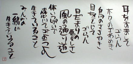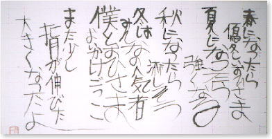 2003年・・・その後 大野市の絵葉書コンテストに入選した作品が本に載りました。 そのときは、気づかなかったのですが、全体で7610点の応募があり、最優勝1人〜入賞まで、計35人。 そして、入選が24名でした。 その中に選ばれていたんです。 再び感激! 誰がなんと言っても、しゅうくんの作品が、一番素敵です!!! 2003年5月 2004年・・・その後 通っている養護学校と交流のある県立高校の会報に しゅうくんの作品が紹介されました。 作品が独り歩きを始めた感じです。 今年は高校3年生 学生最後の年になっちゃったね。 また進路決めで、せわしなくなりそうだね。 しゅうくんらしくいられる場所が見つかりますように! 2005年・・・その後 進路が決まりました。 そして・・・・ 高校卒業です。 なずな学童部も卒業です。 淋しいな・・・淋しいな・・・ この1年は学校の実習が忙しく、 なかなか大きな作品がかけませんでした。 でも、半紙にたくさん書いてくれ、 それをはがきにしたりして、それはそれで素敵でした。 高校の今年のカレンダーにも、去年と引き続き しゅうくんの作品が載ることになりました。 卒業、おめでとう! 2006年・・・その後 高校卒業して2年たちました なずなでの習字は終わりになりましたが これからは 成人の習字「ひの」に参加して また素敵な作品を作ってくれることと思います 2007年・・・その後 ひのの教室のほうに来てくれています しゅうくんの作品はファンも多くいつまでも書いてほしいです |