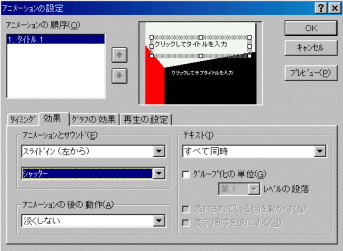 | ・文や画面にアニメーション効果をつけられる。 ・クリップアートというイラストが使える。 |  | ||
