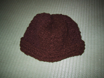 1時間半くらいでできたのがこれ。しかし、翌日「あら、いいじゃない」と母親に奪われ、結局元々編んでおいた変な帽子をかぶることになる・・・。
