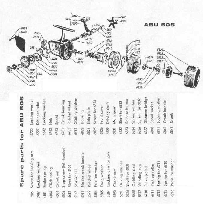 年表に示すように、ABUの覆面スピニングリールは、505,503,506,507,508,501の順に誕生し、ガルシア買収後、601,602と続く。また、米国内では、国内のメーカ名を表示しなければ販売できない時代があり、輸入代理店のガルシアの名称を入れた505,520,507などがある。’94年に後期型1044の生産を終了した後、704が誕生したが、使用部品や組み立て精度に問題があるようで、ヨーロッパのみの販売になっている。この704は、1044の本体を流線形にし、アルミ部品を使用する事で軽量化させたモデルで、構成は後期型1044とほぼ同じである。リールの大きさで分類すると、1044は505,503,520,506,704とほぼ同じ大きさで、一回り大きい507(左巻き),508(右巻き),Gold Max507MkUと、601,602は小型軽量モデルである。