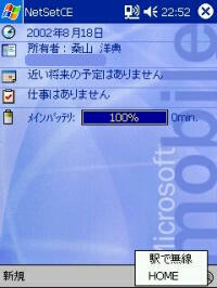 自分はプロバイダが「駅でインターネット体験」というものに対応しているので、 これを利用してインターネットを楽しむことが出来ます。利用料は無料です。 2002年7月で終了予定でしたが、期間が延長されて今でも楽しめます。 こちらのほうは設定も簡単でしたが、一個だけ注意するのは、 無線LANユーティリティ内の無線暗号の設定で64bits(HEX)に 暗号キーを入力することぐらいかな。 ![]() ![]() あとは、説明書どおりにすればカンタンにログインできるし、 ログアウトもサスペンドするか、無線LANをオフにするだけなのでカンタンです。 (PIEではログアウト用のウィンドウが表示されません。NetFrontだとでてくるけど) また、家と外のLAN設定の切り替えにはNetSetCEというソフトが便利です。 画面の右下のアイコン(右から二つめ) ![]() ![]() これをタップすると設定されたモードがプルダウンメニューで出るので、 選んだ後にリセットすればOKです。 ただ、これで設定できるのはTCP/IPだけなので、 やっぱり無線暗号を設定する手間はありますが、 かなり便利なソフトです。 このサービスを利用して実際にやっているのは、 ・PIE、NetFrontでネットブラウズ (メールは無線LANでは危なそうなのでやめました) ・Hikkyで2ちゃんねる閲覧 といったところです。 ネットブラウズはPIEがそんなに速くないので、PCでの64KのPHS接続に比べても、 あんまり快適になった気はしませんね。NetFrontでもあまり変わりません。 でも、やっぱり通信費を気にしなくていいのはいいですね。 メールはまあ、量が少ないので変わり映えしません。 メーラーのダイヤルアップの設定を切ることにだけ注意。 (e740Report(2)の無線LANの項を参照してください) Hikkyで2ちゃんねるは、Hikky自体の速さもあり、かなり使えますね。 オンラインで各スレッドのDL、オフで閲覧といった感じです。 CE系は老舗の某掲示板よりも、2ちゃんねるの方が口は悪いけど 親切に教えてくれる人が多いし、有益な情報もあるし。 この前もe740でのコントラストの設定が可能になる方法が出てました 怖いので発言は控えてますが、自分としてはかなり重宝しています。 食べ物やさんでは、ノートパソコンで場所をとってしまうのが気になりますが、 PocketPCではあまり気にしないで利用することが出来ます。 いずれは、FTPソフトを使ってHPの更新や、PVPlayerを利用した ストリーミングサイトの閲覧にも挑戦してみたいです。 また、暇があったら無線LAN利用時のバッテリーベンチもやってみたいと思います。 |
