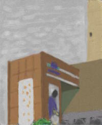 | 桜木町のバス停から見えるビル。 ペーパー効果とかいろいろ 使っているうちに変になっちゃった。 壁のポスターのサッカー選手は なんとなく描けちゃった。 |