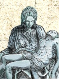 | 今回は身のほど知らずにもピエタに挑戦してみた。 今までのに比べるとよく描けたと思うけど、首の角度と表情がイマイチ。 後ろの壁は手持ちのCGソフトのテクスチャを改造した自作。大理石っぽく見えるかな。元のテクスチャタイトルは「スポンジ」だったけど・・・。 |