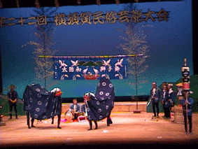 若松社中の馬鹿躍り(ひょっとこ踊り)。/浦賀虎踊り保存会は親子二頭の虎。