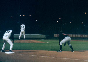 コーヒーは5杯くらい飲んだろうか?7回表が終わりセブンス・イニング・ストレッチとなった。みな起立すると、まずはゴッド・ブレス・アメリカのテープが流れた。私はスタンドの様子を写真に撮ろうとしていたが、回りの若者達は起立はしてるが、歌ってる人は少なかった。ポケットに手を突っ込んだまま隣の人と話をしている者もいた。「照れてる人が多いのかなぁ?」と思ったが、Take me out to the Ball gameになった途端、みな元気に大声で、振りまで付けて歌いだした。私のカメラの方に向かって手を振る者までいた。「う〜ん?」確信は無いが、愛国心丸出しの歌にうんざりした気分を、本来の野球を楽しむ歌で振り払っているようにも感じた。「日本人旅行者よ勘違いしないでくれ。こっちが俺たちの歌なんだ〜」と言っているようだった。