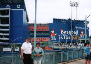 スタンドに出て一番先に飛び込んできたのは、やはりライト方面に聳える巨大な電光掲示板だった。得点の他に、ラインナップやボールカウント、他球場の経過も表示され、圧倒するような大きさだ。バックスクリーンを挟んで左中間にある大型モニタが小さく見える。そのモニタの前辺りに、新庄が初ホームランを打ち込んだ外野席がある。4層のスタンドから僅かにポールの内側に飛び出てる部分を除くと、外野席はこの小さなスペースだけだ。レフトのポール際にはメッツの永久欠番に混じってジャッキー・ロビンソンの42番も飾られていた。差別などの困難に立ち向かい黒人大リーガーの先駆けとなった彼の功績を称え、42番はメジャー全球団(決定時に使用されていた場合は、使用選手が引退後)で永久欠番になっている。その事は97年に行われた彼のデビュー50周年を記念したセレモニーで発表された。場所はここシェイスタジアムでだった(メッツ対ドジャース戦の5回終了時)。