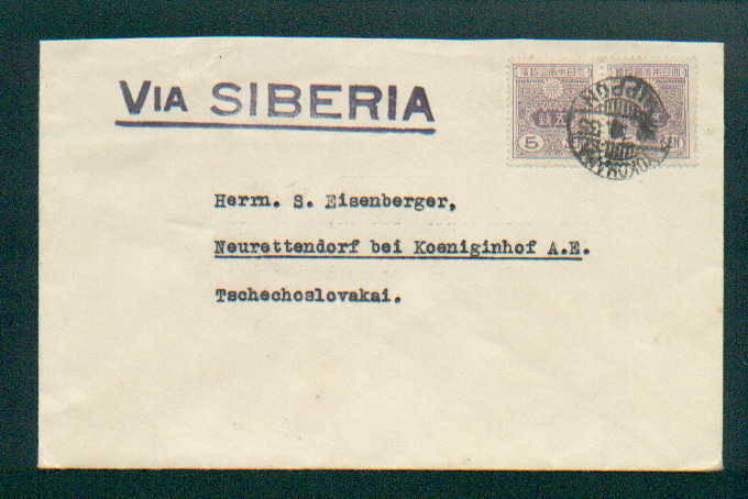 1935年9月30日10銭風景切手・チェコスロヴァキア宛・横浜外信印