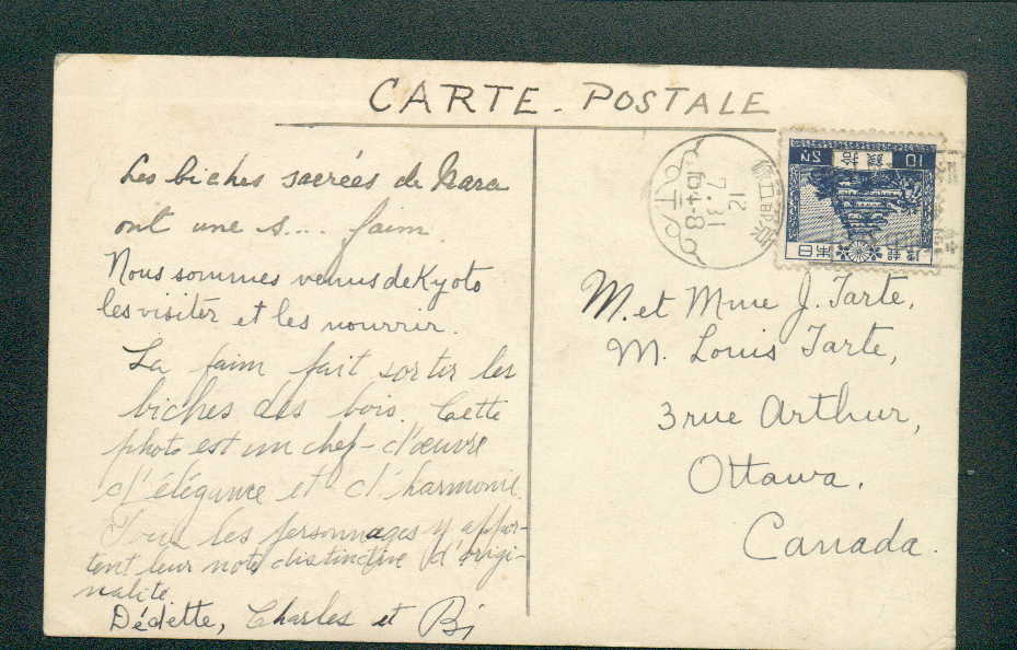1937年7月11日10銭風景切手・カナダ宛・京都五條印