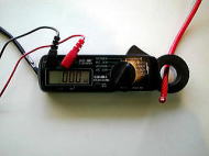 このようにしてケーブルを挟むだけで、何アンペア流れているかが人目で分ります。 |