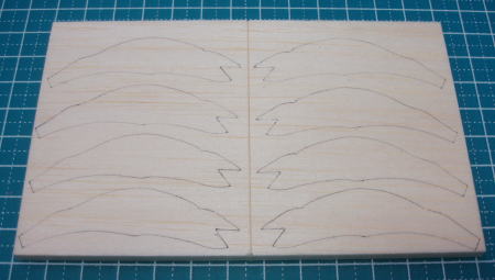 柔らか目のバルサ5mmに 左右対称に型を写す。 |