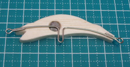 針金を挟み込む溝を掘り、 木工用の瞬間接着剤で張り合わせる。 |