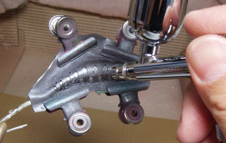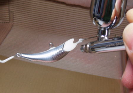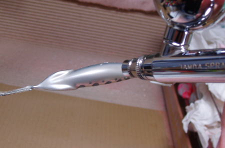 エアブラシでシルバーマイカを薄く吹き、 光沢を消す。 吹き過ぎるとウロコ模様が消えてしまうので注意。 |