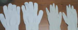 軍手(左)の下に薄いゴム手袋(右)をすると