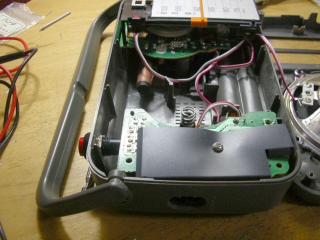 電源ユニット基板を元に戻して改造終了。電池を入れて、バンドをAMないしFMに合わせて、スイッチのオン/オフを確認すること。