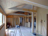 天井パインは全て貼られ、梁にもパインが貼り始められていました。