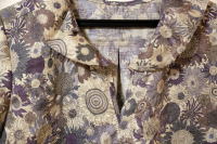 ●大川友美 『シンプルシック』 「ショールカラードレス」 ・ショールカラー ・ラグランスリーブ ・ループ布紐ボタン ●フリーサイズ ・バスト=125cm ・袖口幅=26cm ・袖周り=165cm ・袖 丈=67cm ・着 丈=113cm (−1cm) ・紐ベルト=182cm ●材料 ・布 地=145cm幅×250cm ・接着芯=60cm×25cm ・ボタン=11mm×4個 初のラグラン袖ですが、これは楽チンです。前あき部分の曲線ステッチは上手くできたとは言い難いが、私にしては十分です。そして、ギャザー寄せはやっぱり苦手です…。細いループ布作りはミシンが進まず、師匠のMさんにやって頂きました。ループの出具合を揃えるのが難しかったです。襟付けでは前あき部分との重なり、ステッチがきれいにできなかったです(>_<)。 |