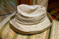 こちらは、麻・綿素材で、被ったときのよれ感がいい感じ、いろいろなスタイルにマッチします。(と思っています)(*^_^*) |