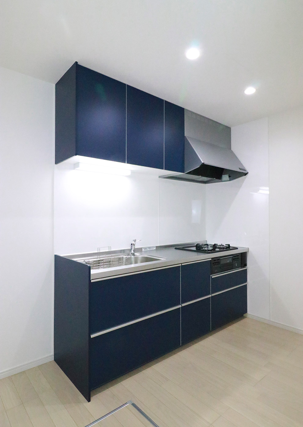 内部仕上げはホワイトを基調に、キッチン・トイレはネイビーブルーでアクセント