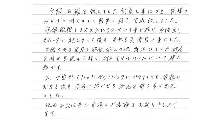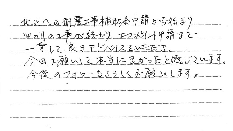 北区への耐震工事補助金申請から始まり、四ヶ月の工事が終わり、エコポイント申請まで、一貫して良きアドバイスをいただき、今回お願いして本当に良かったと感じています。