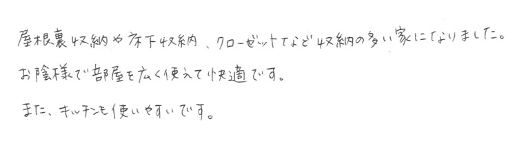 屋根裏収納や床下収納、クローゼットなど収納の多い家になりました。