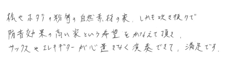 桧やホタテの粉等の自然素材の家、しかも吹き抜けで防音効果の高い家という希望をかなえて頂き、サックスやエレキギターが心置きなく演奏できて、満足です。